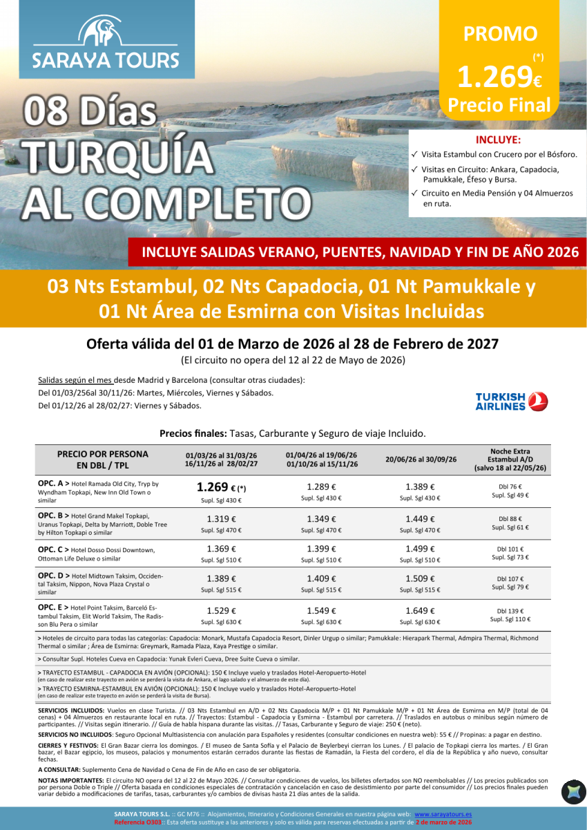 Turquía al Completo 8 días: Estambul, Capadocia, Pamukkale y Esmirna con Visitas Incluidas hasta Feb27